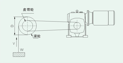 計(jì)算減速機(jī)輸出轉(zhuǎn)矩T T=物體重量W×10×滾輪半徑(D/2)(皮帶輪傳動(dòng)傳動(dòng)比i2×皮帶輪傳動(dòng)效率η1) |